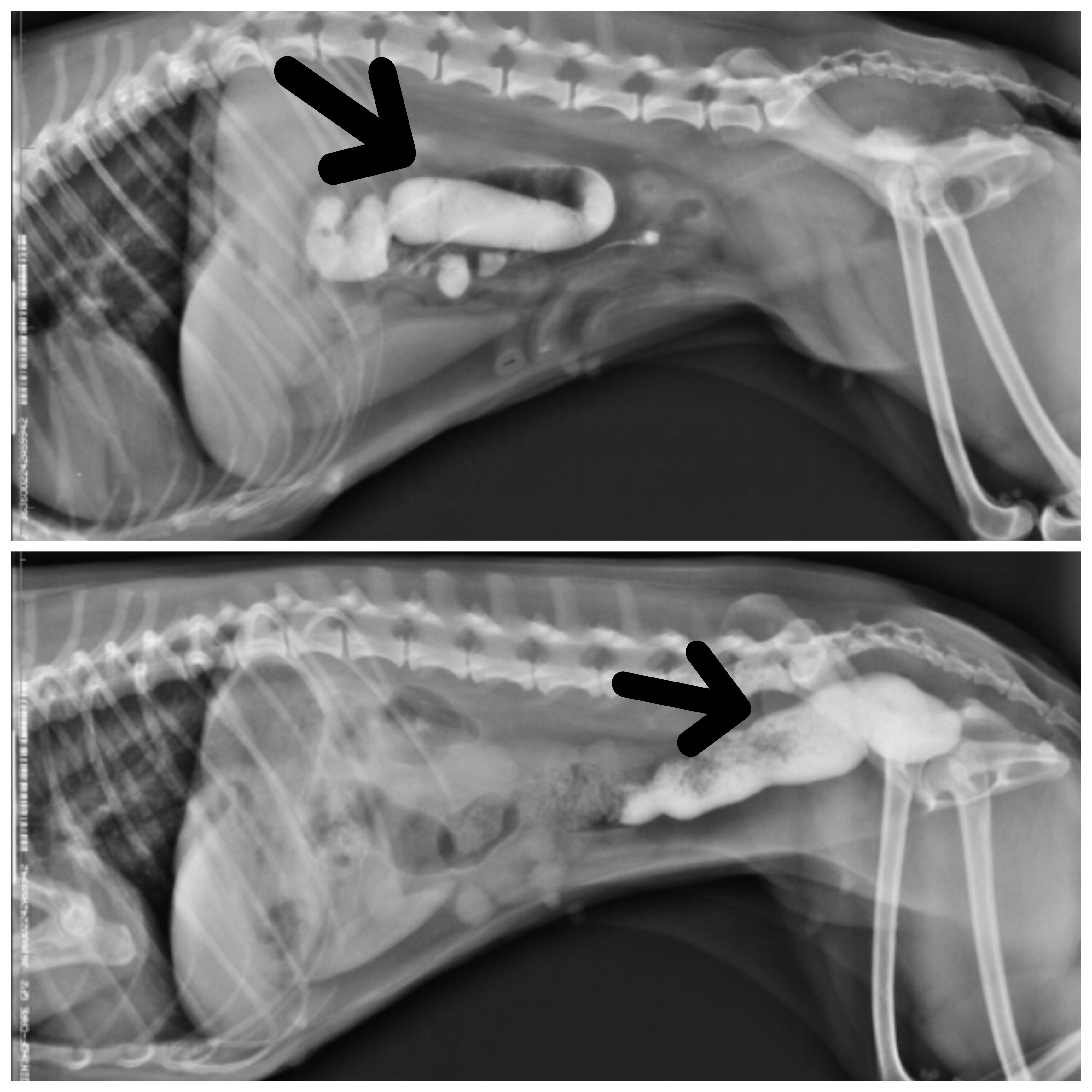 Queste sono le radiografie di una barboncina venuta in visita per vomito e costipazione. Le radiografie mostrano una zona radiopaca che indica l’enorme ingestione di sabbia che a distanza di due giorni ha raggiunto il retto. I corpi estranei possono avere forma e consistenza oppure essere microscopici, ma se ingeriti in grandi quantità, possono causare patologie subostruttive o ostruttive…quindi ATTENZIONE!!